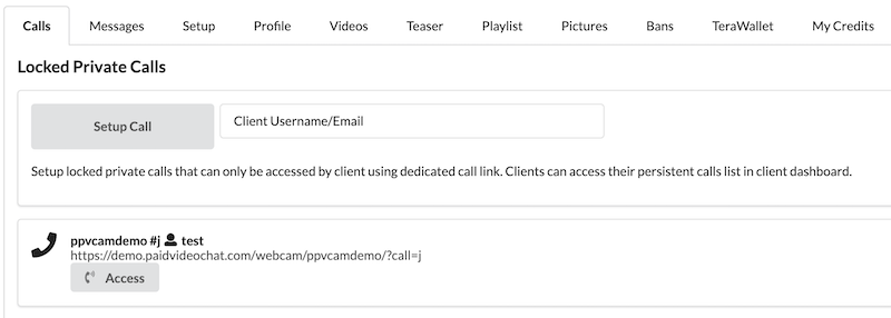 Paying clients can invite performers to do private video chat shows and pay per minute. They first need to register as clients and add some money to their virtual wallet on site to be able to request private shows.